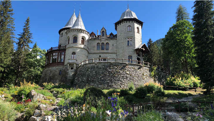 Above Gressoney-Saint-Jean, in the Walser territory and at the foot of Monte Rosa, lies Castel Savoia, a late 19th/early 20th-century building that served as the summer residence of Italy’s first queen, Queen Margherita, wife of King Umberto I of Savoy. Specifically located in the Belvedere area, the interior of the castle is rich in painted decorations, wood paneling, medieval-inspired furnishings, and numerous references to the daisy, the flower from which the queen took her name.
